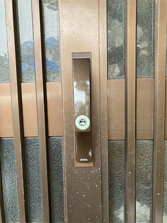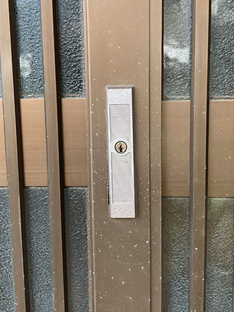 玄関引戸の鍵が少し前から動きが悪くなってしまい使い辛いことに加え、鍵を紛失してしまったことで鍵交換を検討されている状況でした。使用し辛くなった要因は、経年劣化による錠前不調と、扉自体の傾きです。扉の傾いている状態をお客様にも目視で確認して頂きました。適正位置で鍵を取り付けできるように扉を加工。すぐに交換できる複数の鍵を見てもらった上で交換品をお選び頂き、現状より防犯性と利便性の高いディンプルキーに交換致しました。