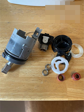 水栓から出る水がちゃんと止まらなくなってしまったとのことでご連絡をいただきました。内部のカートリッジの経年劣化が水漏れの原因でしたので、純正品カートリッジの交換で対応致しました。取り外した際、劣化して破損状態の部品と新品の物を実際に見てもらいました。また、別の給排水の漏水もないかお客様と一緒にチェックして別箇所の漏水が無い事を確認しました。