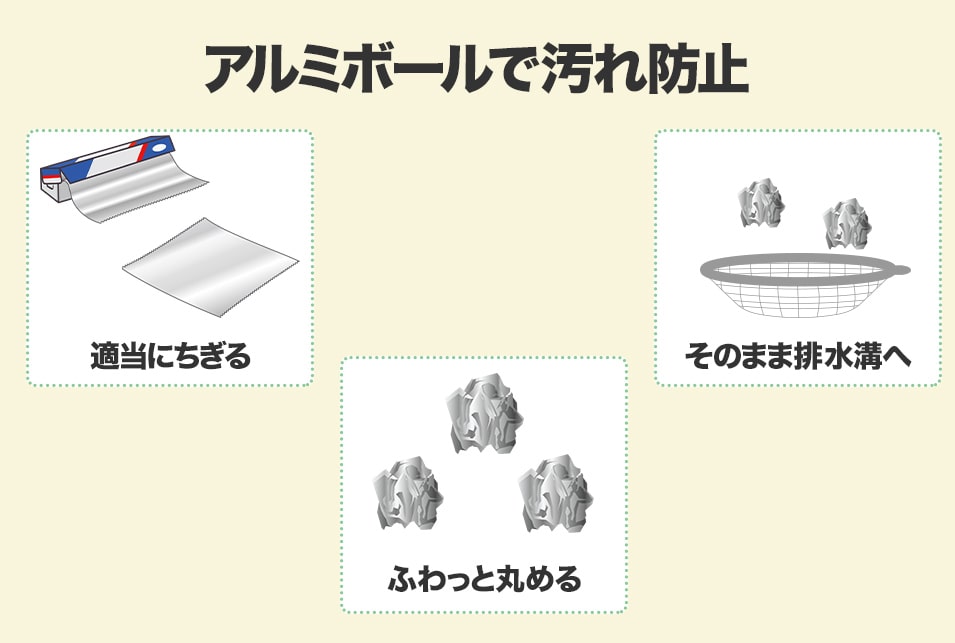 家にあるアルミホイルを適当にちぎって軽く丸め、排水口に直接入れておくだけなのですぐに行うことができます。丸めるときに固く丸めすぎないようにふわっと丸めましょう。