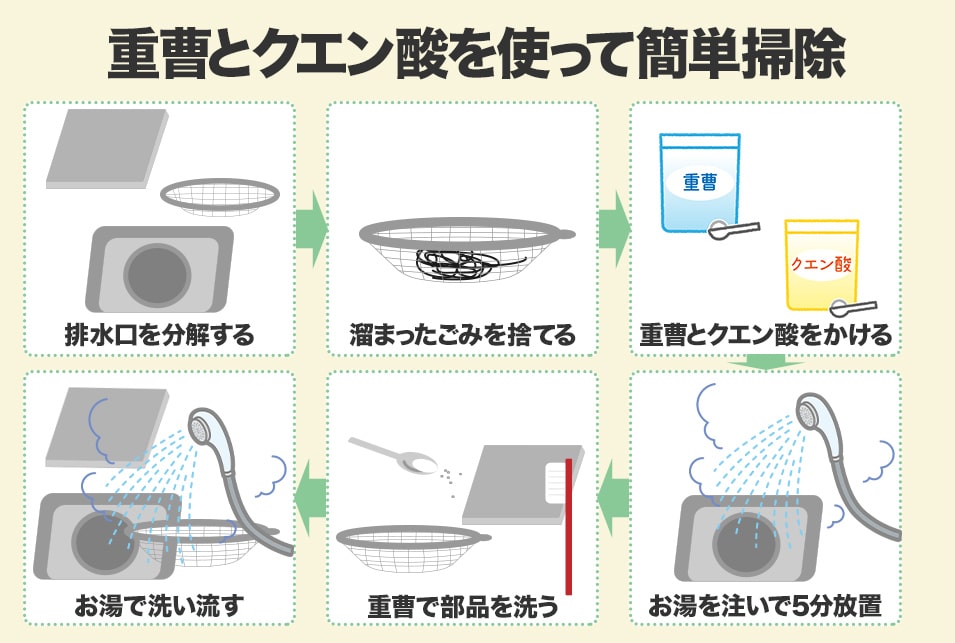 排水口の流れが悪くなってきている気がする、という場合にも効果的です。以下の手順で簡単に行うことができます。