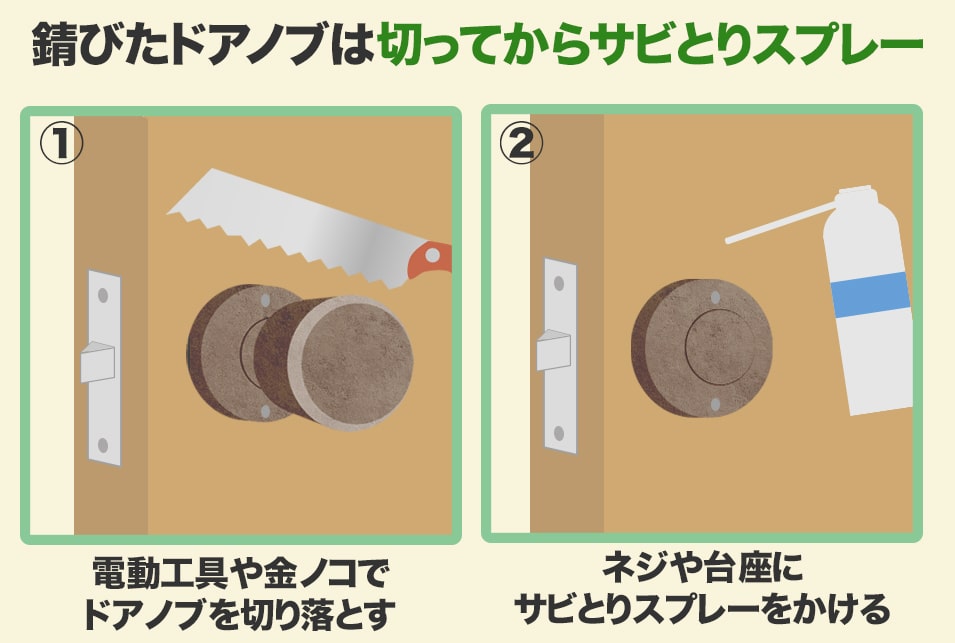錆びて固くなったドアノブは、電動工具や金ノコと、サビとりスプレーを使うことで対処できる可能性があります。