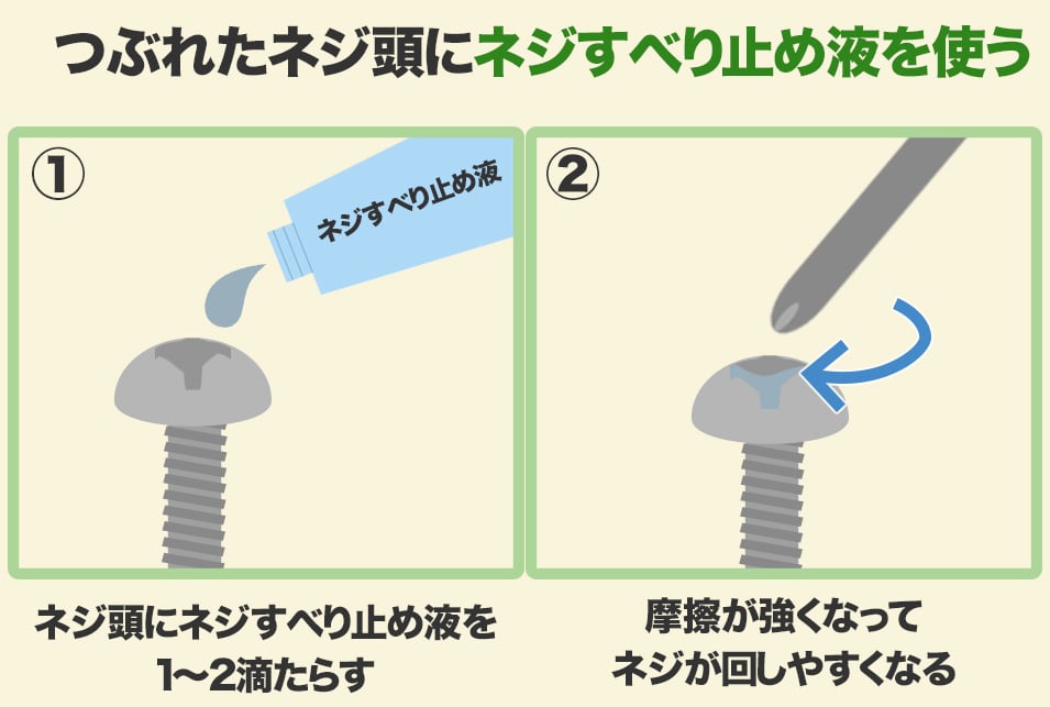 つぶれたネジ山にネジすべり止め液を1~2滴たらすことで、ネジの摩擦が強くなってドライバーが回しやすくなります。