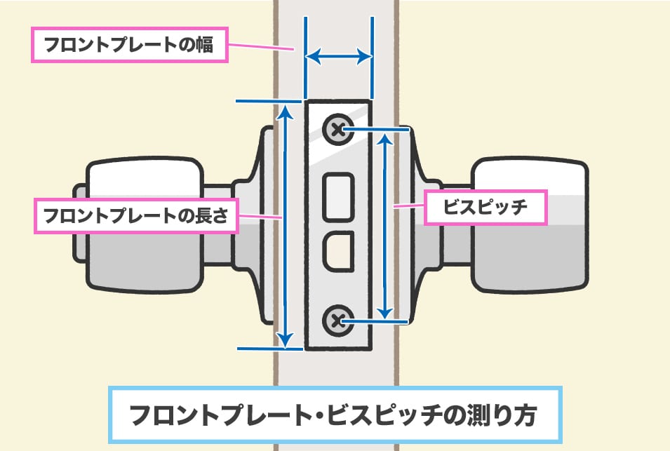 上記図を参考に、既存のドアに取り付けられているドアノブのフロントプレートの縦横幅と取り付けビスピッチのサイズを測定しましょう。