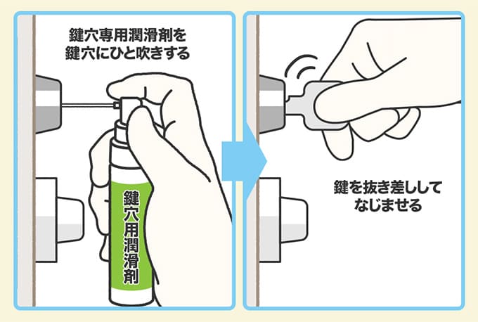 鍵穴に潤滑剤を差すときは『鍵穴専用』のものを用意しましょう。動きをよくするために油を使うイメージがあると思いますが、鍵穴に市販のオイル系潤滑剤やサラダ油などを使用すると故障の原因になります。