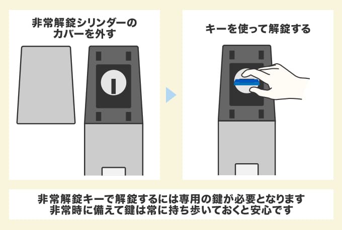 ただし非常解錠キーで解錠する場合、専用の鍵が必要となるため外出時に持ち歩いていないと開けることができない点に注意しましょう。