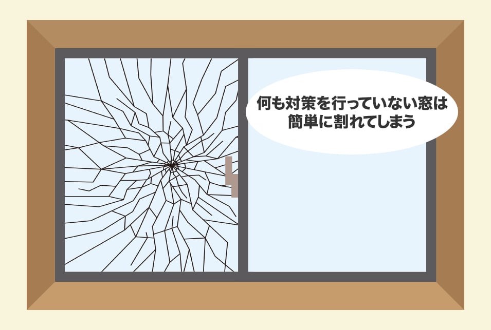 日本ではこの方法が用いられることが多く、最も被害件数が多いといわれています。防犯ガラスへの交換や防犯フィルムを貼っておくことで、被害を最小限に抑えることができます。