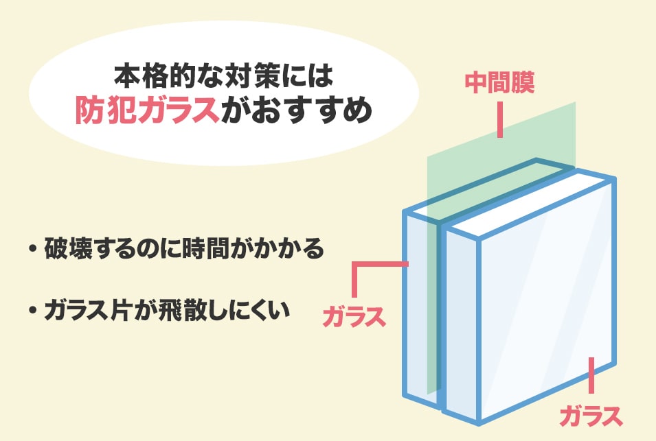 そのため、窓の防犯性を上げるためには、防犯フィルムを貼ったり防犯ガラスへの交換がおすすめです。ガラス交換は業者に依頼する必要があります。
