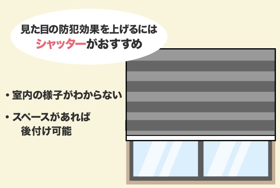シャッターは侵入に時間をかけられることだけでなく、見た目による防犯効果が高いとされています。シャッターを閉めた状態では、室内の様子がうかがいにくいため、犯行に及びにくいといったメリットもあります。
