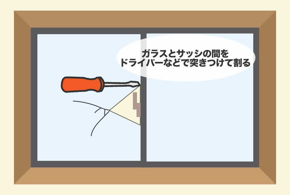 打ち破りのように簡単に行えるにも関わらず、大きな音が鳴らないのが『こじ破り』の特徴です。窓ガラスとサッシの間をドライバーなどで2,3回突きつけると、何も対策を行っていないガラスは簡単に割れてしまいます。