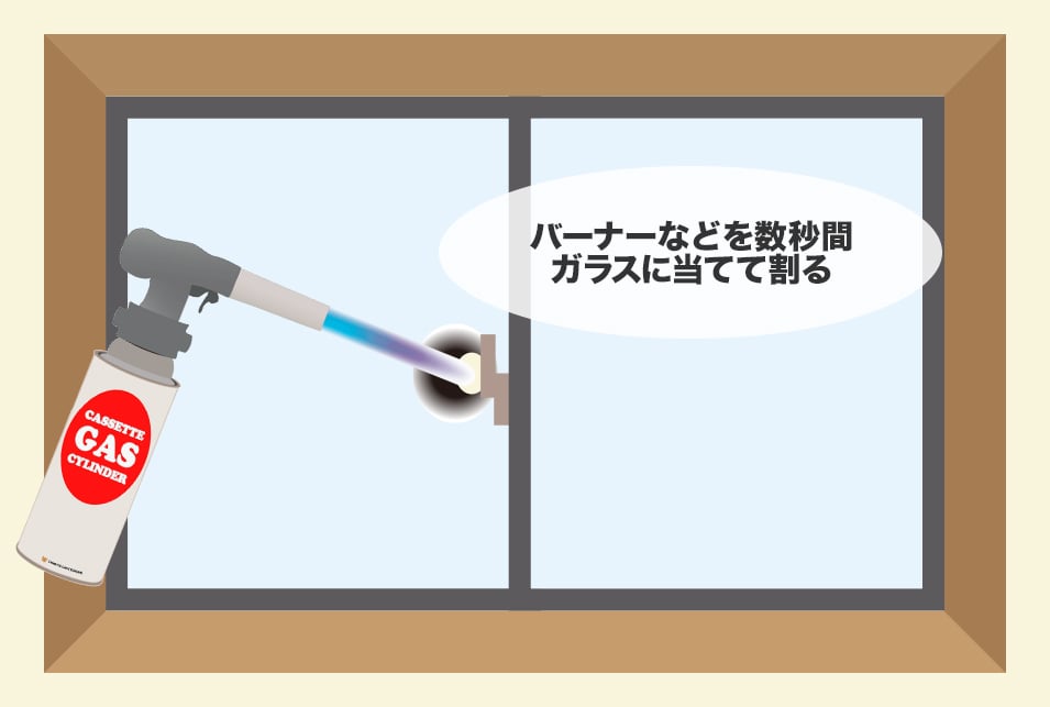 バーナーやライターなどを数秒間ガラスに熱を当てて割る方法です。一般的な単板ガラスの場合は急激な温度変化に耐えきれず、10秒程度で割れてしまいます。