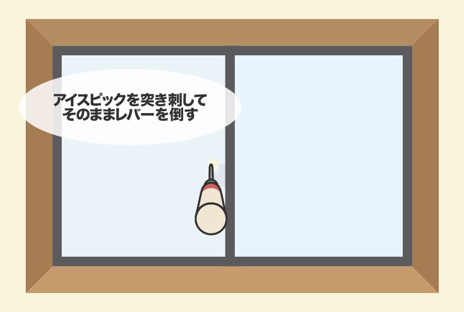 クレセント錠周辺にアイスピックで小さな穴をあけて、そのままレバーを倒して解錠する方法です。