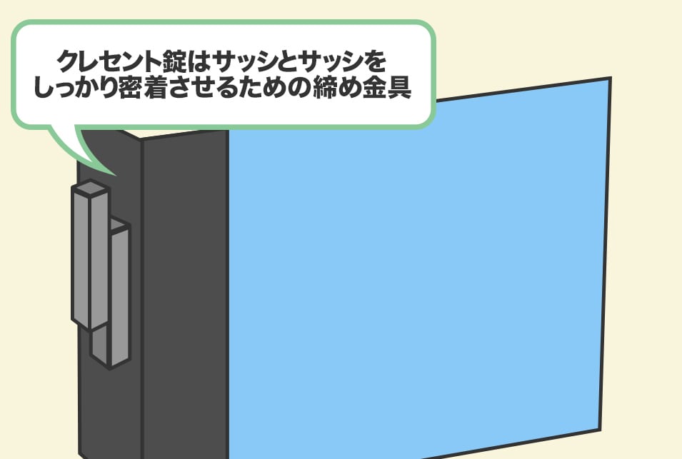 一般的な引き違い窓に設置されているのが『クレセント錠』です。このクレセント錠は『鍵』として考えられている場合が多いですが、本来はサッシとサッシをしっかり密着させるための締め金具であり、防音・気密効果を高める効果があります。
