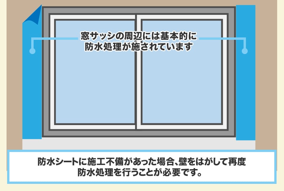 サッシや窓枠を取り付ける際には、周辺に防水処理を施すことが一般的です。この防水シートにシワや隙間があると、そこから雨漏りが発生する原因になります。