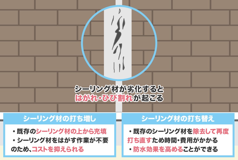 シーリング材を修理するときは、上記の2種類の方法が用いられます。基本的には打ち替えを行うほうが、防水効果を上げることができるのでおすすめです。