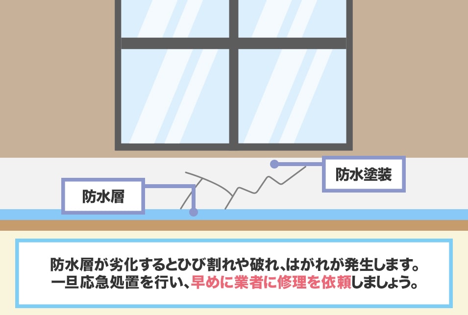 劣化するとベランダにひび割れや破れ、はがれが発生し雨漏りが起こる原因となります。破損個所が特定できた場合は、防水テープやシートを使って一時的に応急処置を行っておくことがおすすめです。
