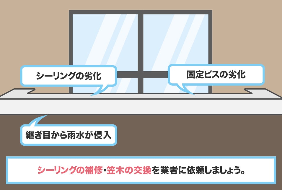 通常の雨なら問題ないですが、強風によって吹き上げられた雨水は笠木の継ぎ目から侵入することがあります。また笠木を固定しているビスや、継ぎ目を埋めるシーリング剤が劣化して隙間が生まれると、そこから雨水が入ることがあります。