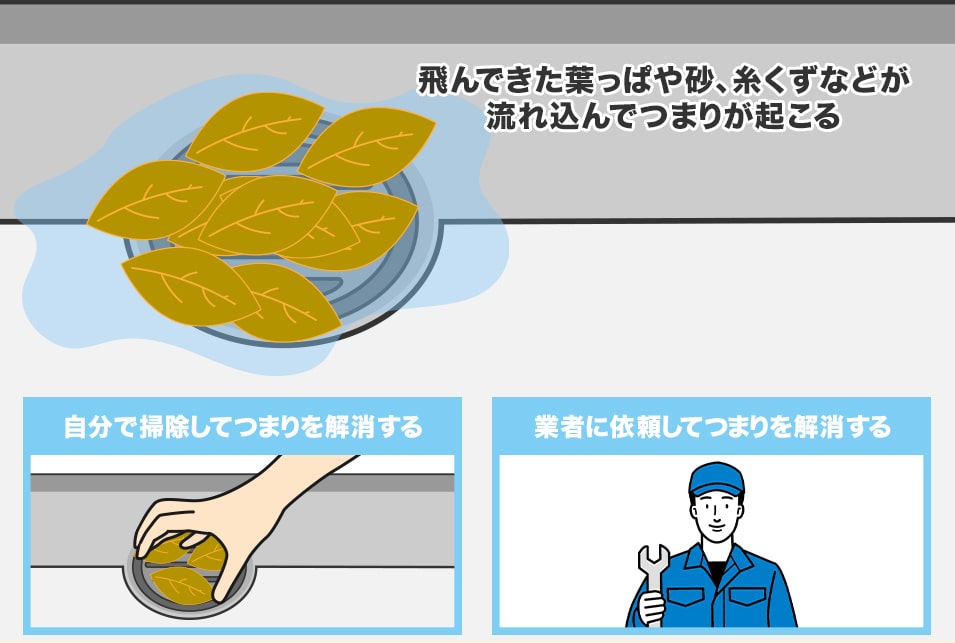 ベランダには一般的に排水溝が設置されていて、雨水を地上へ排出する役割を担っています。ベランダの排水溝は屋外ということもあり、飛んできた葉っぱや砂洗濯物の糸くずなどが流れ込み、つまりが発生することがあります。