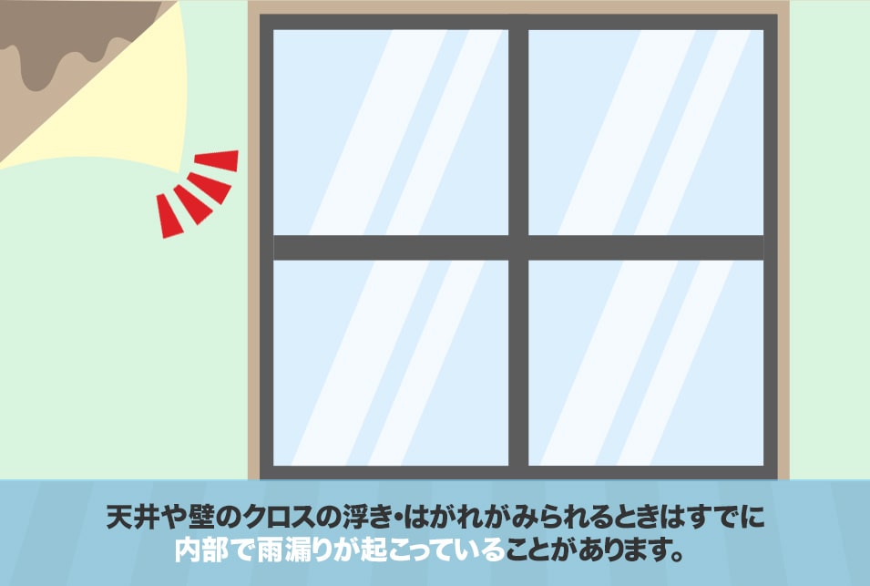 天井や壁のクロスが一部だけ浮いている・はがれてきたという場合は、内部で雨漏りがすでに起こり始めている可能性があります。