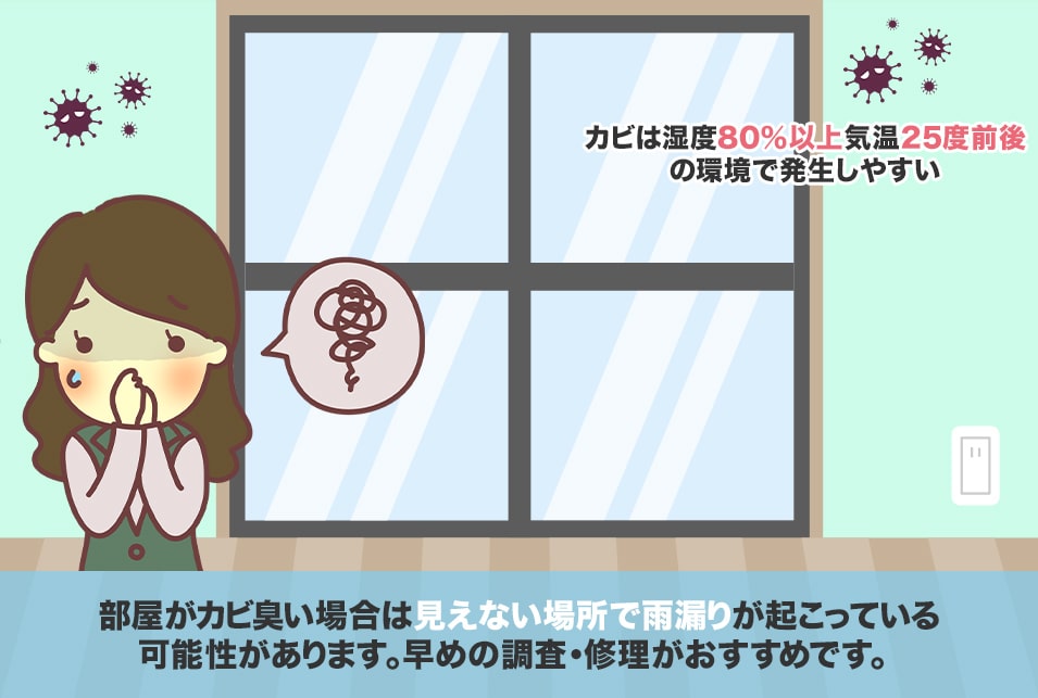 なんとなく部屋がカビ臭い・・・というときは、天井裏や壁の内部などの見えない場所で雨漏りが発生している可能性があります。
