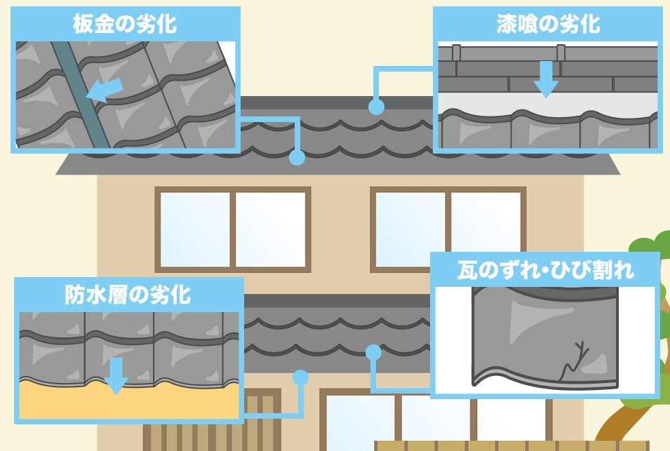 瓦や漆喰が劣化することで防水層に雨水が侵食すると、屋根全体の工事が必要になる可能性もあるため、早めに対処しておくと被害を最小限に抑えることができます。