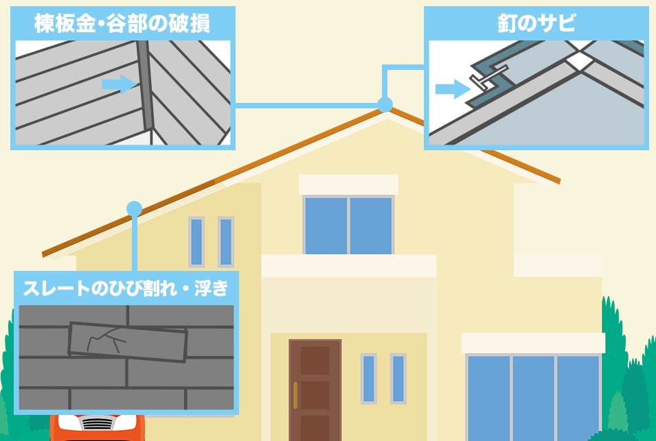 スレート屋根から雨漏りが起こるとき、下記のような原因が考えられます。