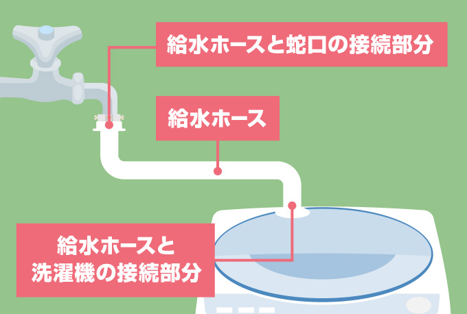 給水ホースの途中から水が染み出ていたり、給水ホース自体が濡れていないか調べてみましょう。