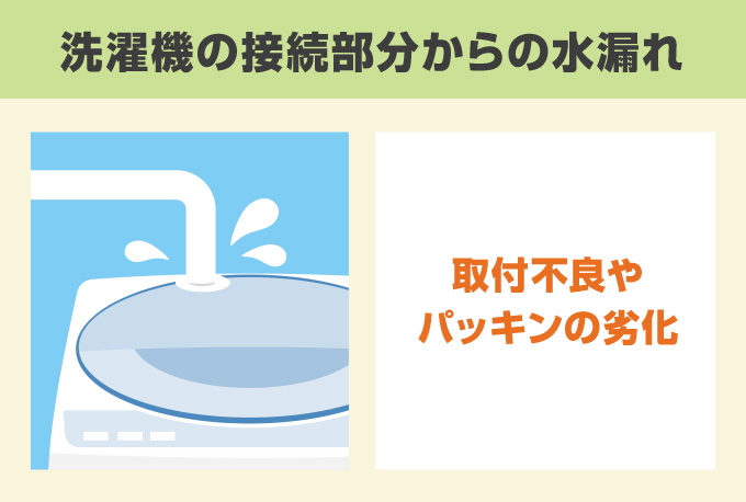 給水ホースと洗濯機の接続部分から水漏れしているときは、取付不良やパッキンの劣化が原因と考えられます。