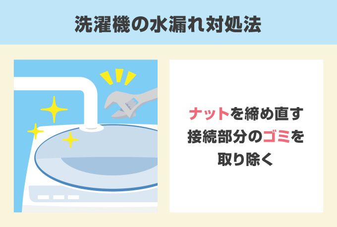 給水ホースと洗濯機の接続部分にあるナットが緩んでいたり、傾いているようであれば、まっすぐ取り付け直して、きちんとナットを締めましょう。