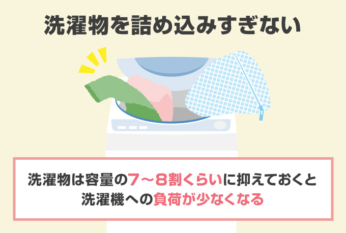 洗濯物を詰め込みすぎると、洗濯時の振動が大きくなるので洗濯機本体や接続部分へ負荷がかかりやすくなり、部品の破損につながります。