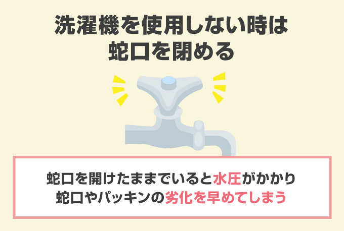 洗濯機の蛇口を開けたままにしているという方は多いかもしれませんが、水圧がかかって蛇口やパッキンの劣化を早めてしまうので、洗濯機を使い終わったら蛇口を閉めるようにしましょう。