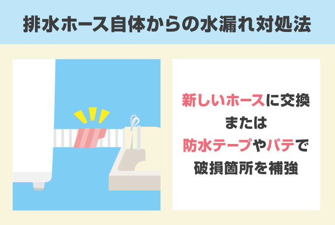 排水ホース自体から水漏れしている場合は、穴や亀裂といったホースの破損が原因となっていることが多いです。