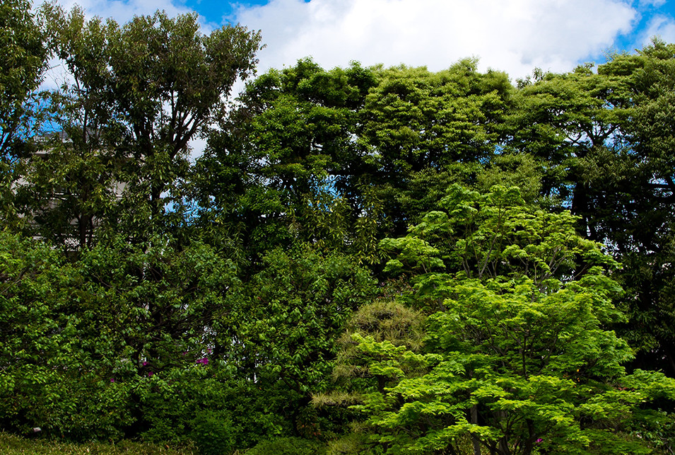 1年を通して常に葉っぱをつけている樹木のことをいいます。この説明だけ聞くと、同じ葉っぱが何年もずっとついていると思ってしまいますよね。ずっと同じ葉っぱが生き続けるのではなく、どこかの葉っぱが落ちてしまっても、違う場所で葉っぱが育って、常に緑を保っているのが常緑樹です。常緑樹にも、常緑広葉樹と常緑針葉樹があります。