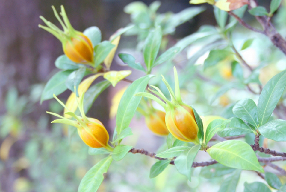 クチナシは、6~7月に白い花を咲かせ、秋には実をつけます。クチナシの実は黄色の染料としても使われています。クチナシという名前は、実が熟しても口が開かないことから「クチナシ」になったといわれています。育つと、1~2mほどの高さになります。