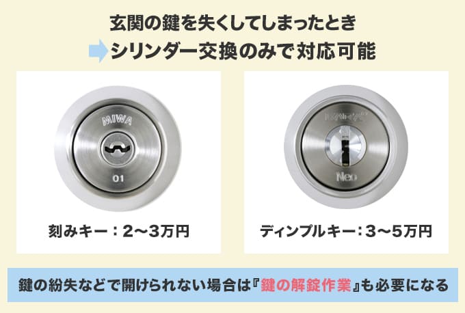 ただし、「鍵を紛失して、家の中に入れない(鍵を開けられない)」という場合は、『鍵開け作業』が必要になるため、上記相場に鍵開け料金が追加されます。