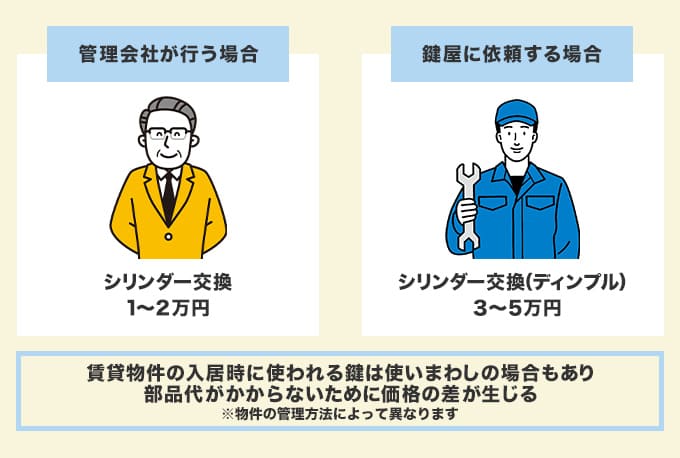 この入居前の鍵交換は、「管理会社・物件のオーナー」が行われるもので、鍵屋に依頼される場合は「シリンダー交換(ディンプル)3~5万円」が相場です。