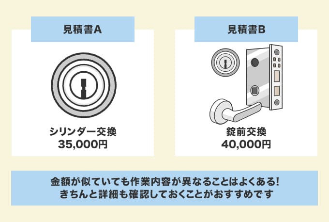 「鍵をなくしただけなので、シリンダーのみを交換すればいい。だから、見積書Aが安くていい!」と思いませんか?