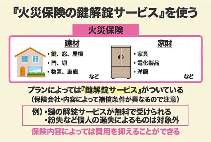 そのため保険内容によって異なりますが、鍵の開錠サービスを利用すれば費用を抑えることもできます。