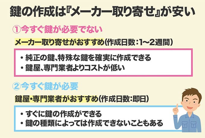 メーカーに取り寄せすれば特殊な鍵でも対応でき、鍵屋などに依頼するよりはコストが低くなるというメリットがありますが、時間がかかるというデメリットもあります。