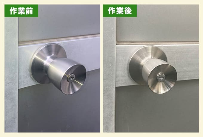 会社勝手口ドアの鍵交換のご依頼でした。従業員の方が鍵の紛失をされており、防犯上鍵の交換を検討されていました。同じ部品を使用した玉座交換にて対応いたしました。