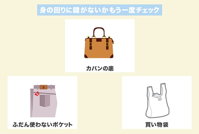そのため、当たり前のことだと思っていても服・カバンなどのポケットに鍵がないか必ず確認するようにしましょう。