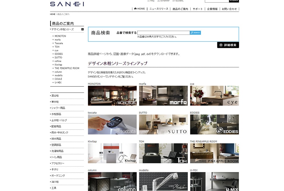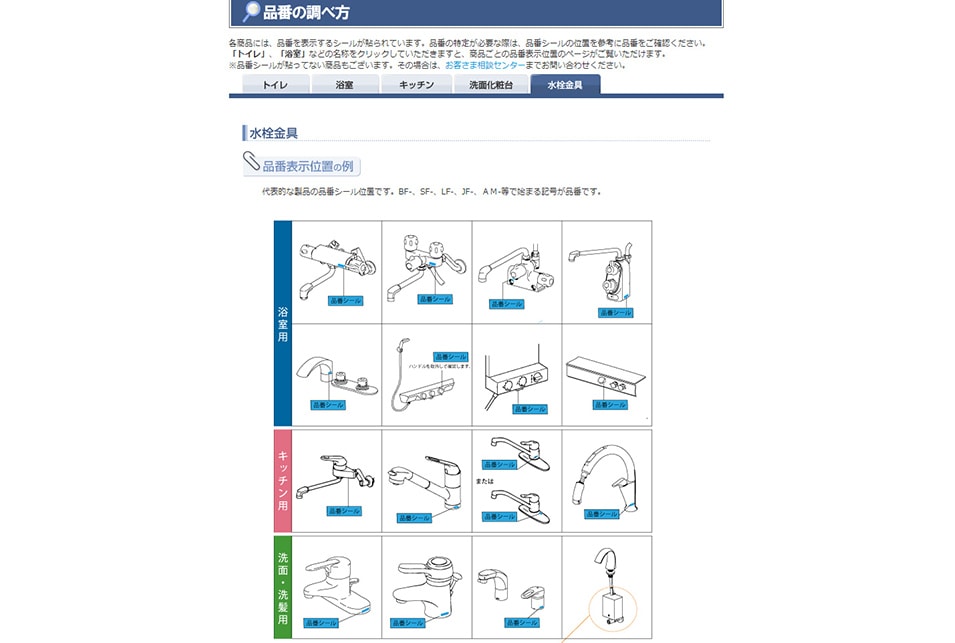 品番シールが見つからない場合、SANEIのホームページでは「商品検索ページ」があるので、商品情報ページ内の左にあるメニューのカテゴリーから調べたい蛇口のカテゴリーを選び、画像を参考に品番を特定することができます。上記URLをクリックすると商品検索ページに移動します。