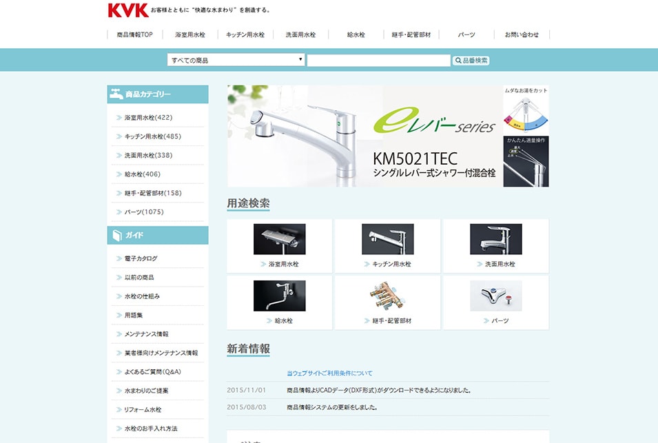 KVK公式ホームページの「商品情報ページ」からカテゴリーごとに水栓を探すことができます。上記URLをクリックすると商品情報ページに移動します。