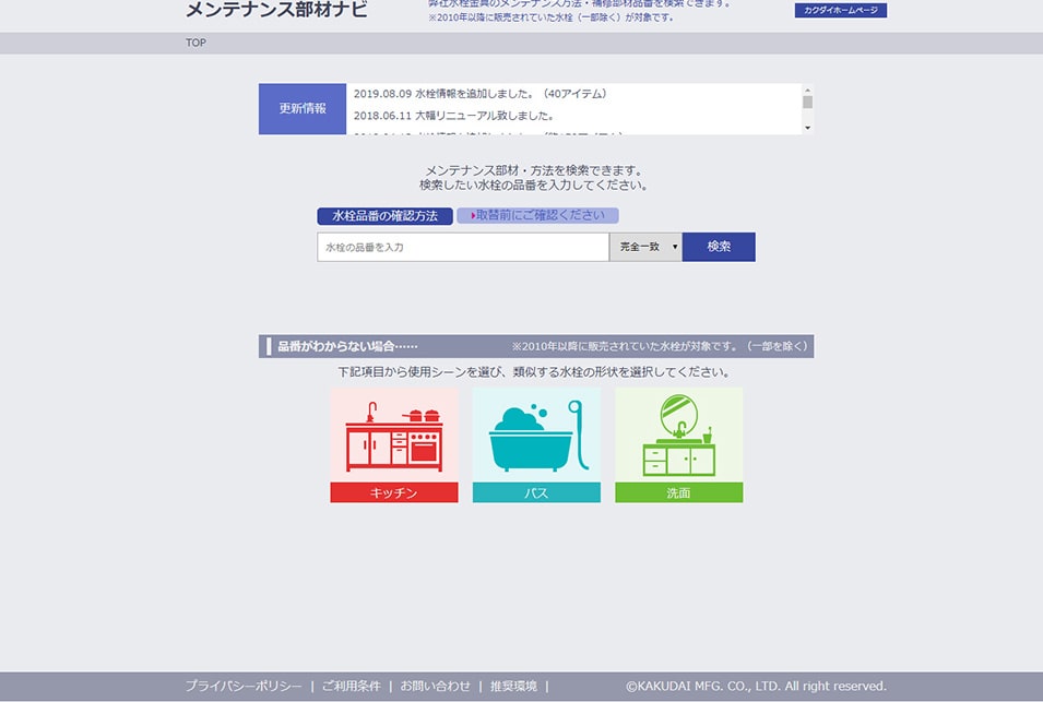 もし、シールが剥がれてしまって品番が分からない場合は、カクダイHPのメンテナンス部材ナビの「品番が分からない場合」のページで、水栓の種類や使用場所から探すこともできます。上記URLをクリックするとメンテナンス部材ナビの品番が分からない場合に移動します。