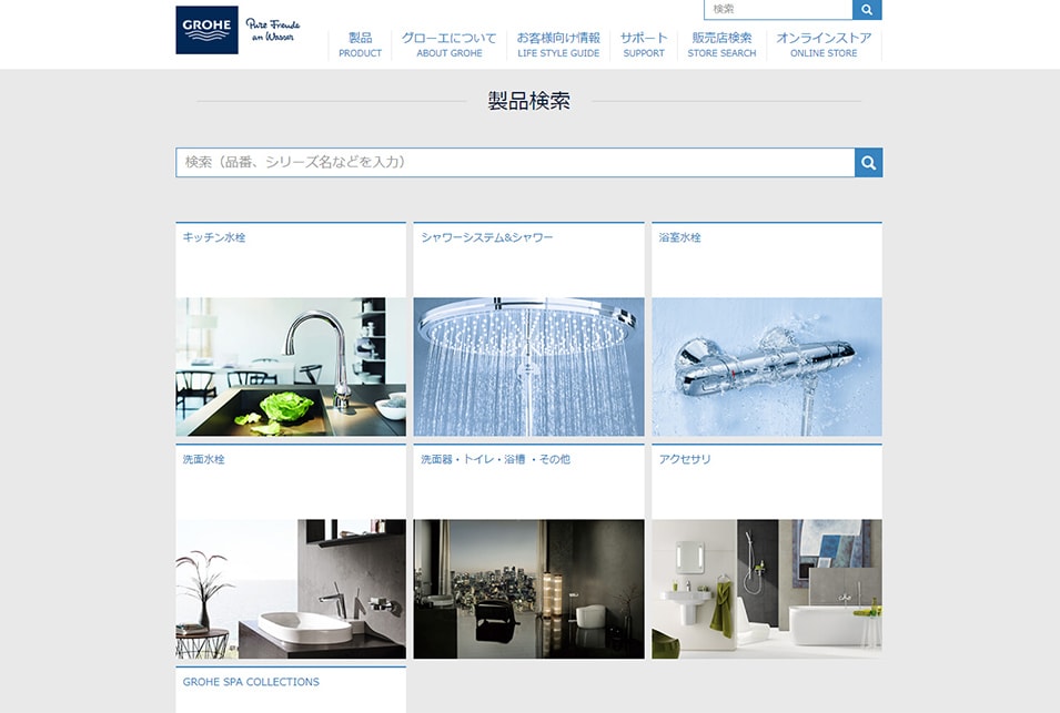 GROHEの「製品検索ページ」で蛇口のカテゴリーと画像を選んでいきながら品番を確認することができます。上記URLをクリックすると製品検索ページに移動します。