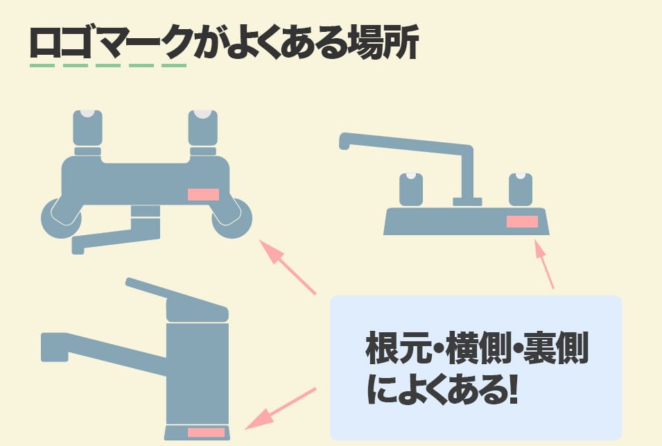 水栓の根元や横側、そして裏側にメーカーのロゴマークがないか確認してみましょう。蛇口本体にロゴマークが刻まれているものもあれば、シールに印字されているものもあります。