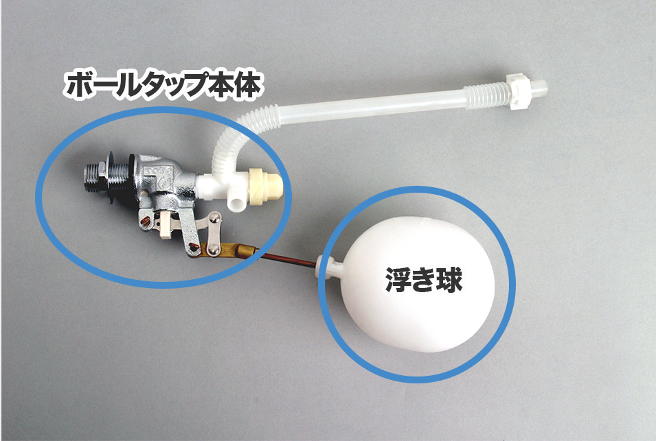 ボールタップとは、トイレのタンク内にある部品の一つで、主に先端に楕円形の浮玉がついており、根元はタンク外の給水管に繋がっている部品です。