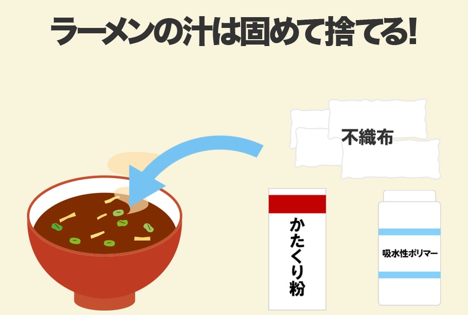 災害用トイレにも使われている吸水性ポリマーを使ってラーメンの汁を固めてから可燃ごみに捨てるという方法もあります。