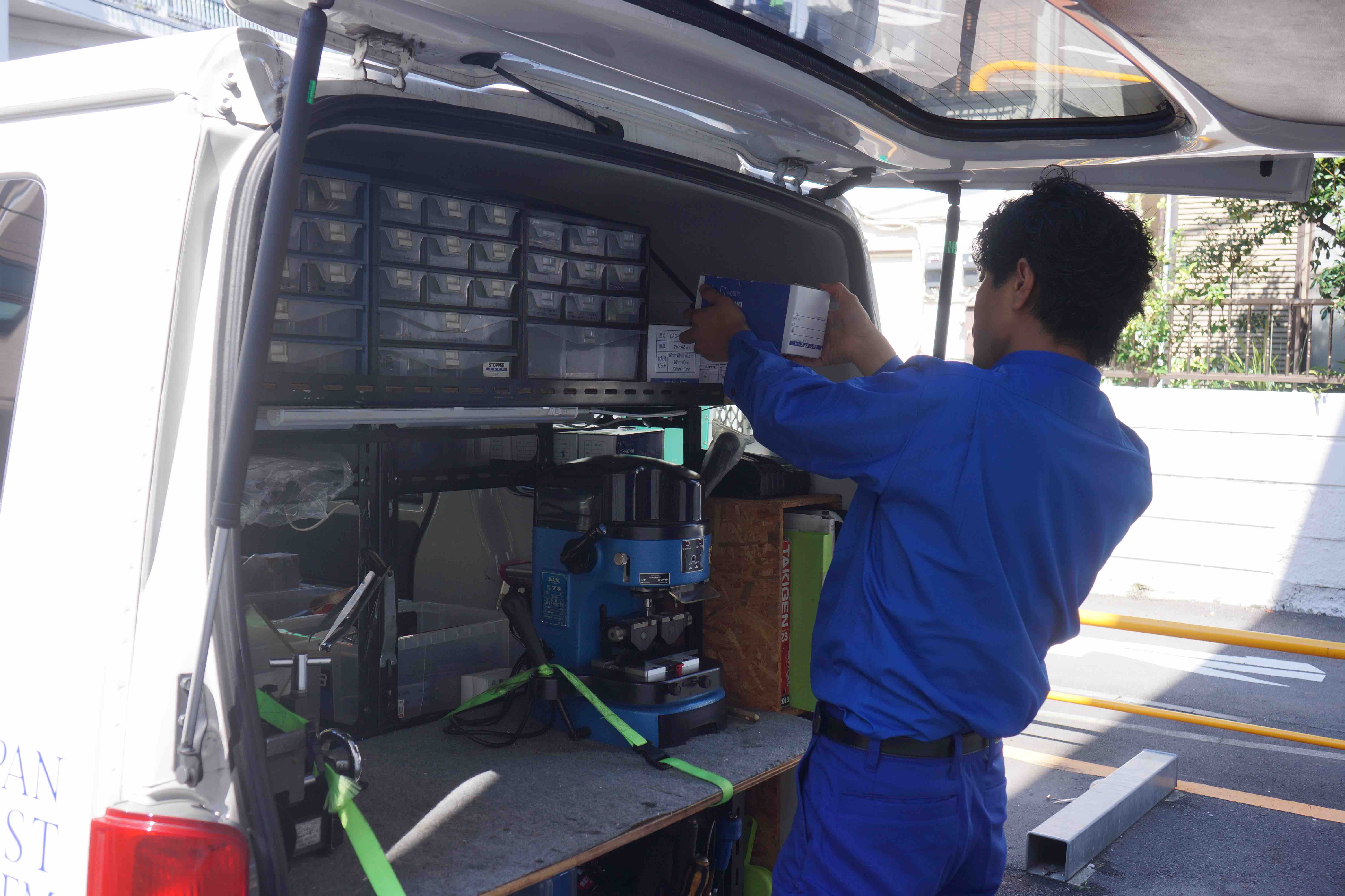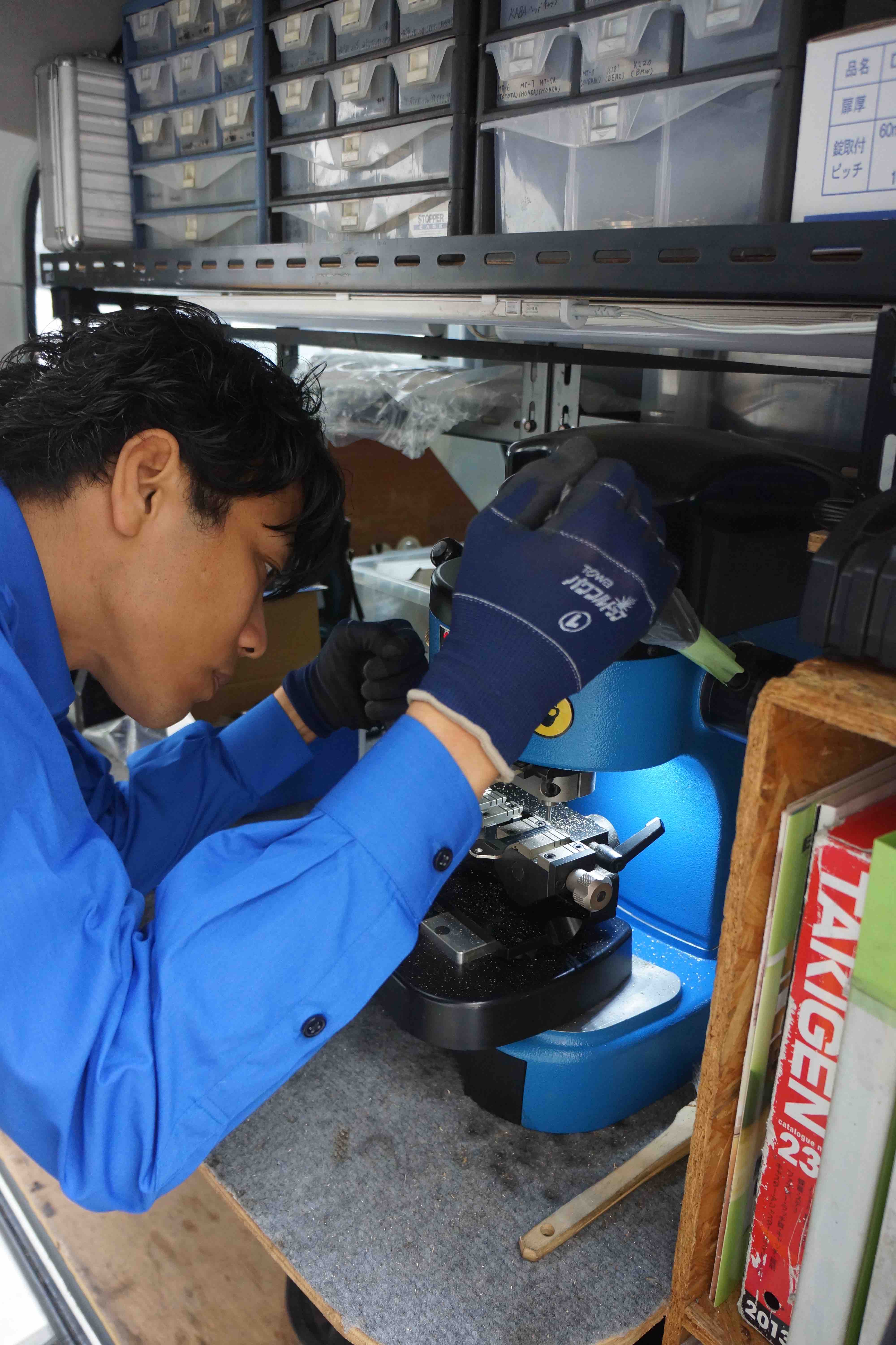 大西:車にスペアキーを作成する機械を積んでいますから、すぐに作れますよ。ドアの鍵であれば、1本作るのにかかる時間は5分くらい。あとでお見せしますね。