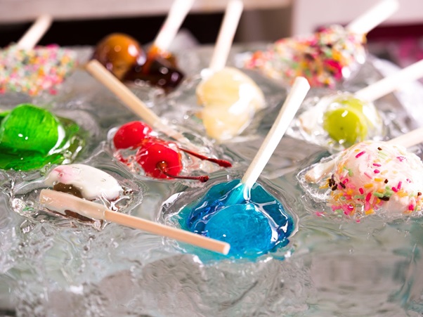 みかんとかパインを水飴でコーティングしたもので、氷の上で冷やしながら売ってます。食べるときはモナカの皮に乗せて食べるんです